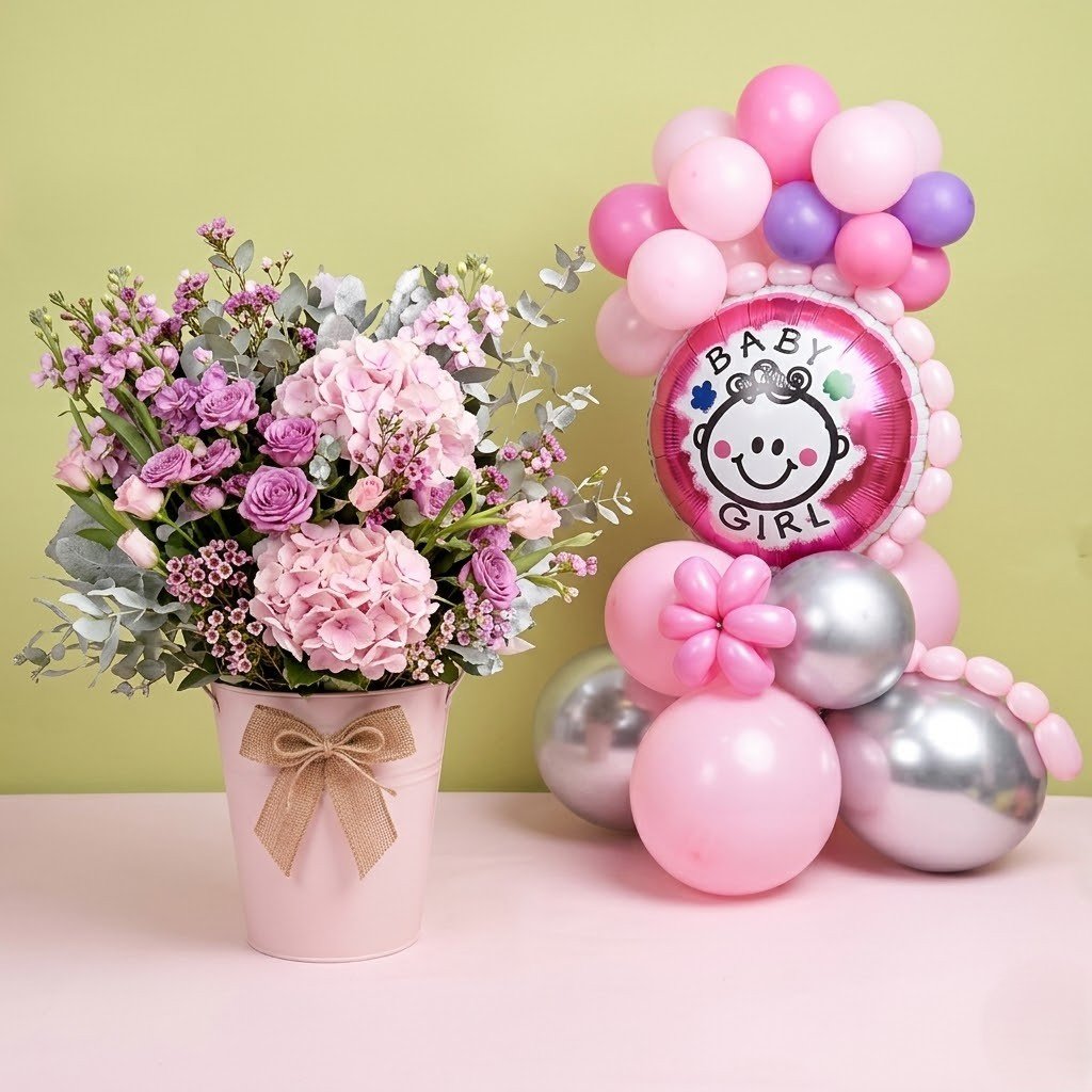 Adorable and celebratory, the Baby Girl Balloons with Flowers Bouquet is a charming arrangement designed to welcome a little princess. Featuring a delightful mix of pink balloons styled like a pillar, this setup adds a joyful and festive touch to any baby celebration.