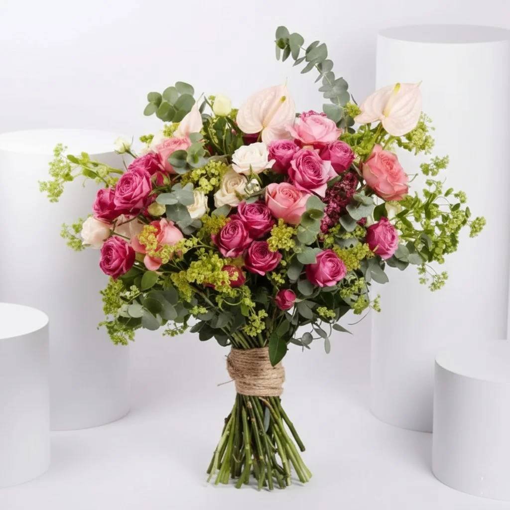 Soft, elegant, and radiantly charming, the Bloom Aura Bouquet is a graceful floral arrangement designed to spread warmth and beauty. Featuring a harmonious blend of pink anthuriums and roses, thoughtfully styled with a rustic finish, this handcrafted bouquet by Warda Petals exudes natural elegance and timeless appeal—perfect for gifting or elevating any space.