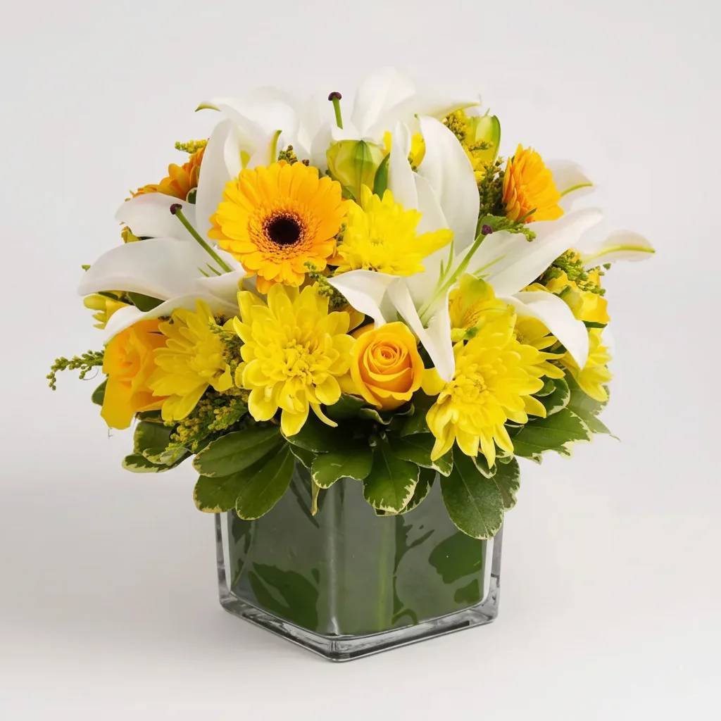 Bright, cheerful, and full of joy, the Joyful Flower Vase is the perfect way to uplift someone’s day. Featuring a vibrant mix of white lilies, yellow gerberas, alstroemerias, roses, solidstars, chrysanthemums, and fresh pittosporum leaves, all beautifully arranged in a 12 x 12 cm glass vase, this handcrafted creation by Warda Petals radiates happiness and charm.