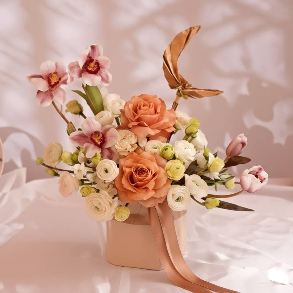 Sophisticated, serene, and inspired by the beauty of Ramadan nights, the Moonlit Ramadan Elegance Arrangement is a refined floral creation that reflects warmth and grace. Featuring a harmonious blend of cappuccino roses, rich brown tulips, and delicate white lisianthus, this luxurious arrangement by Warda Petals is beautifully presented in a chic ceramic pot with graceful festive accents—perfect for elevating your Ramadan décor or gifting experience.
