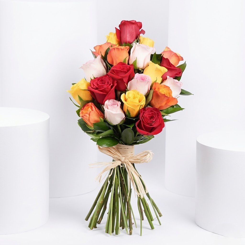 Vibrant, cheerful, and full of life, the Multicolor Roses Beauty Bouquet is a delightful blend of radiant hues. Featuring a mix of red, orange, pink, and yellow roses with fresh greenery, this beautifully tied bouquet brings joy and elegance to every occasion.