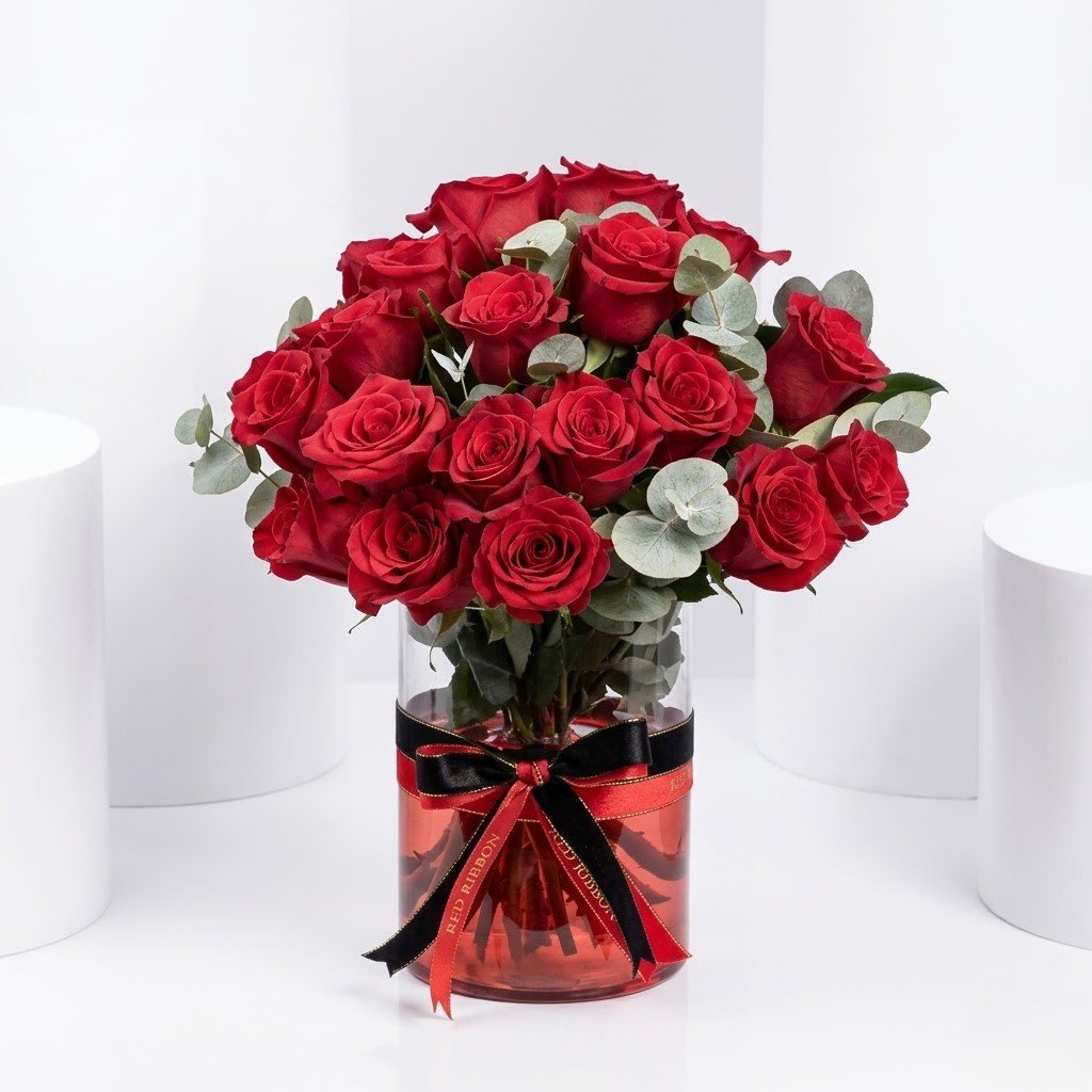 Romantic, elegant, and timeless, the Passionate 18 Roses Arrangement is a classic floral display that beautifully expresses love and admiration. Featuring vibrant red roses accented with fresh eucalyptus, this handcrafted arrangement is elegantly styled in a glass vase—perfect for heartfelt gestures and meaningful celebrations.
